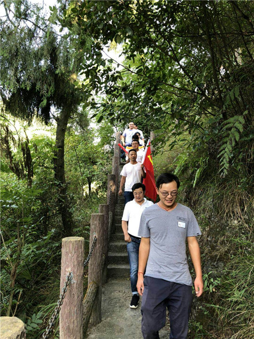 參觀了水田寨中央紅軍總部駐地舊址(花房子)后,全體黨員重走了一段長征路。入黨積極分子李偉扛著黨旗走在前面,“當(dāng)年紅軍走過這里的時候,肯定沒有這樣的臺階,他們就是從沒有路走出來的路,我們很多人缺的就是這樣的開拓精神”。李偉感慨的說到。