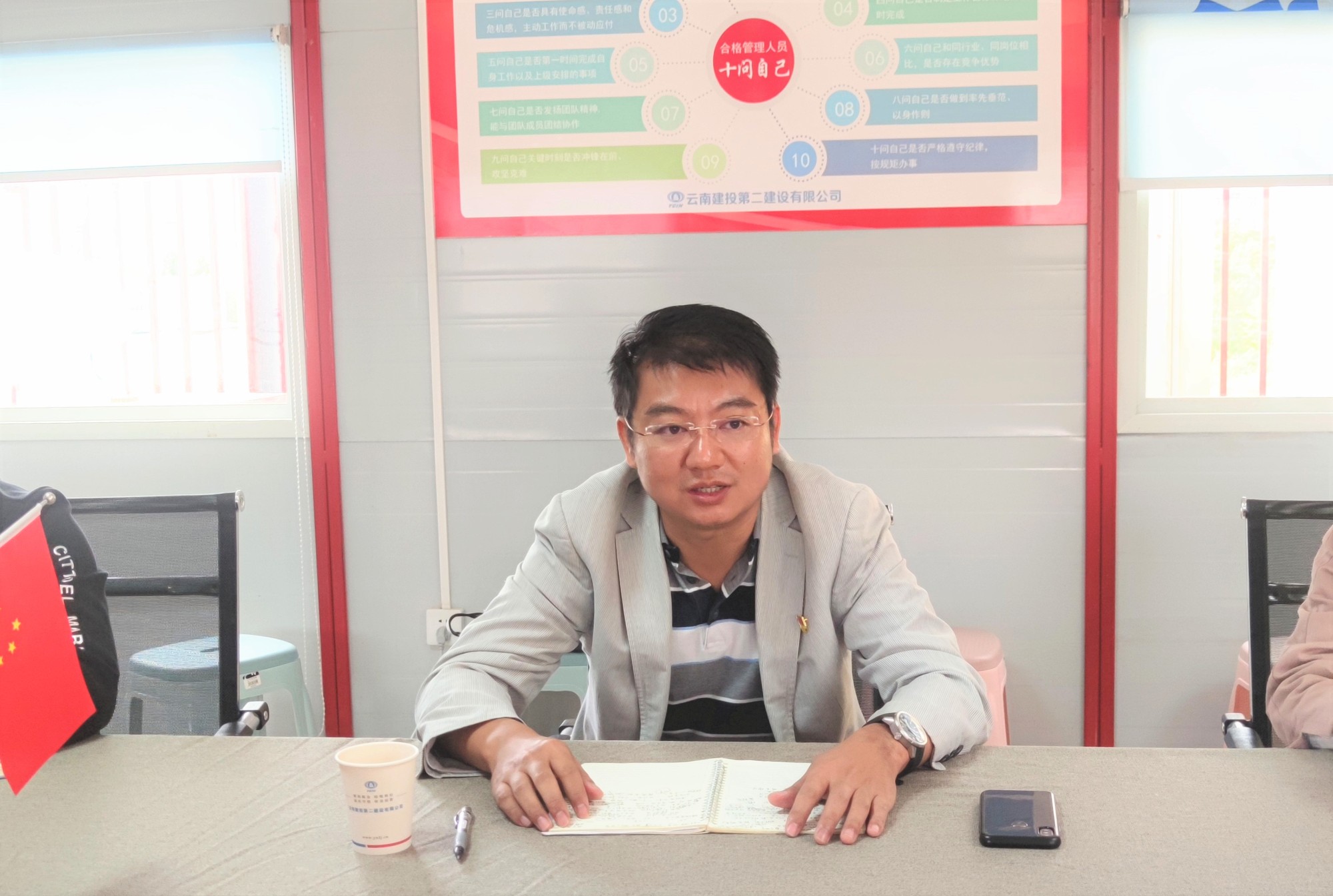 10月20日,公司黨委書記、副董事長萬向遵帶領(lǐng)黨委工作部、生產(chǎn)管理部相關(guān)負(fù)責(zé)人到第九直管部呈貢康復(fù)醫(yī)院項(xiàng)目檢查指導(dǎo)示范黨支部遴選整改情況、“我的職責(zé)是什么”及“十問自己”活動(dòng)開展情況等工作,直管部在昆領(lǐng)導(dǎo)班子、黨員、項(xiàng)目部職工參加會議。