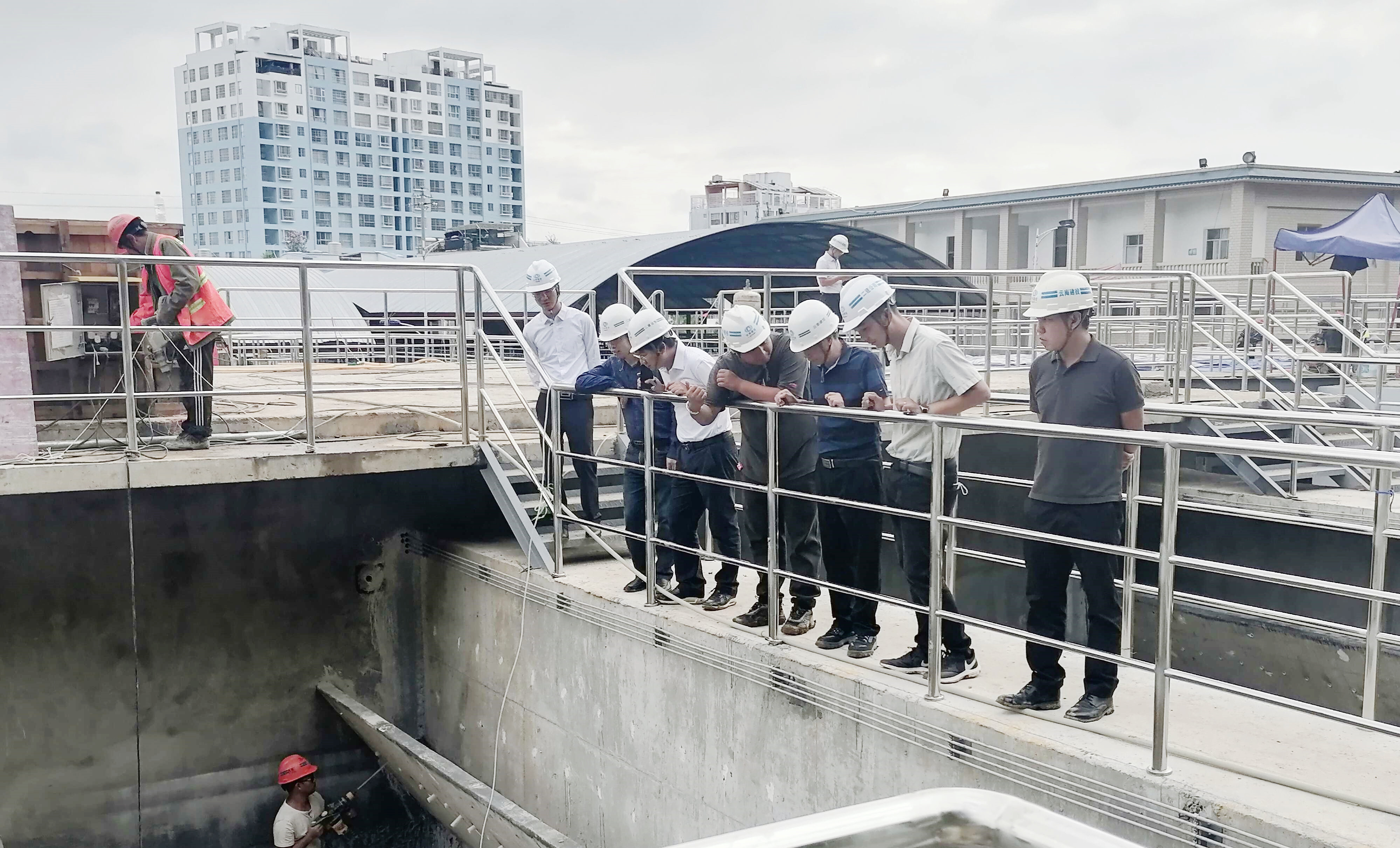 陳定華、萬向遵一行深入到施工現(xiàn)場進行查看,實地了解項目施工情況,對土建及安裝單位的安全及現(xiàn)場進度、質(zhì)量的管控進行檢查。陳定華對項目團隊做出的努力給予了肯定,并指出,一是在施工過程中,要嚴(yán)把安全關(guān)、質(zhì)量關(guān),加強施工前監(jiān)督管理工作。二是根據(jù)施工合同要求,做好進度控制工作,嚴(yán)格落實糾偏措施。三是落實好集團“四保一控一樹”要求,做好現(xiàn)場管控。四是加強項目團隊建設(shè),注重人才培養(yǎng),切實提升項目綜合管理能力。五是三水廠擴建是民生工程,要加快施工進度,確保完成節(jié)點,今年下半年文山市民不再為飲用水堪憂。