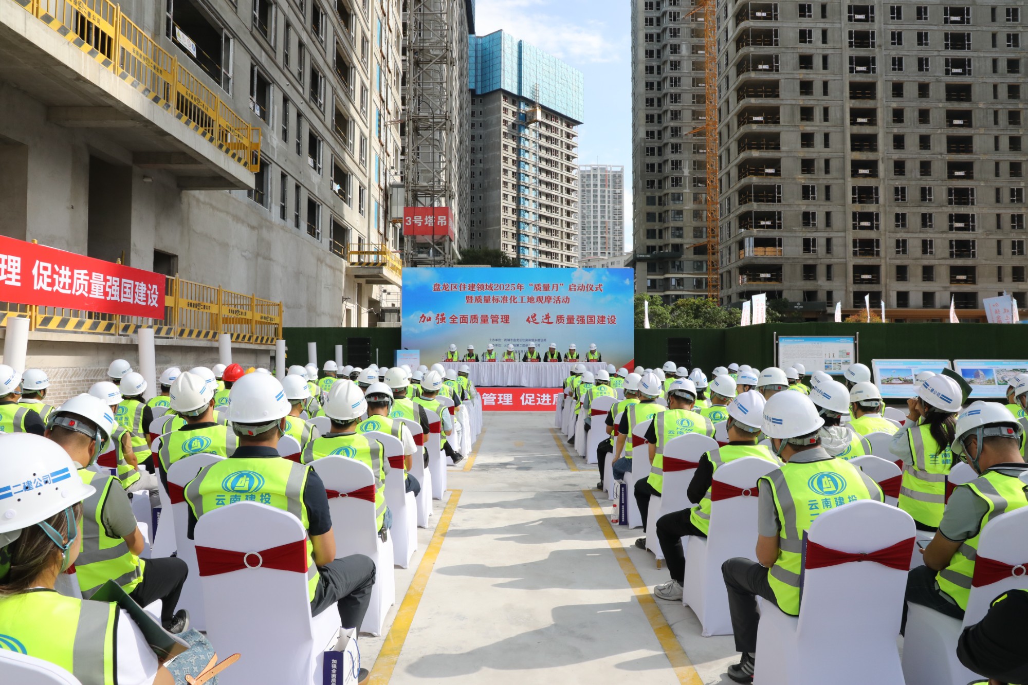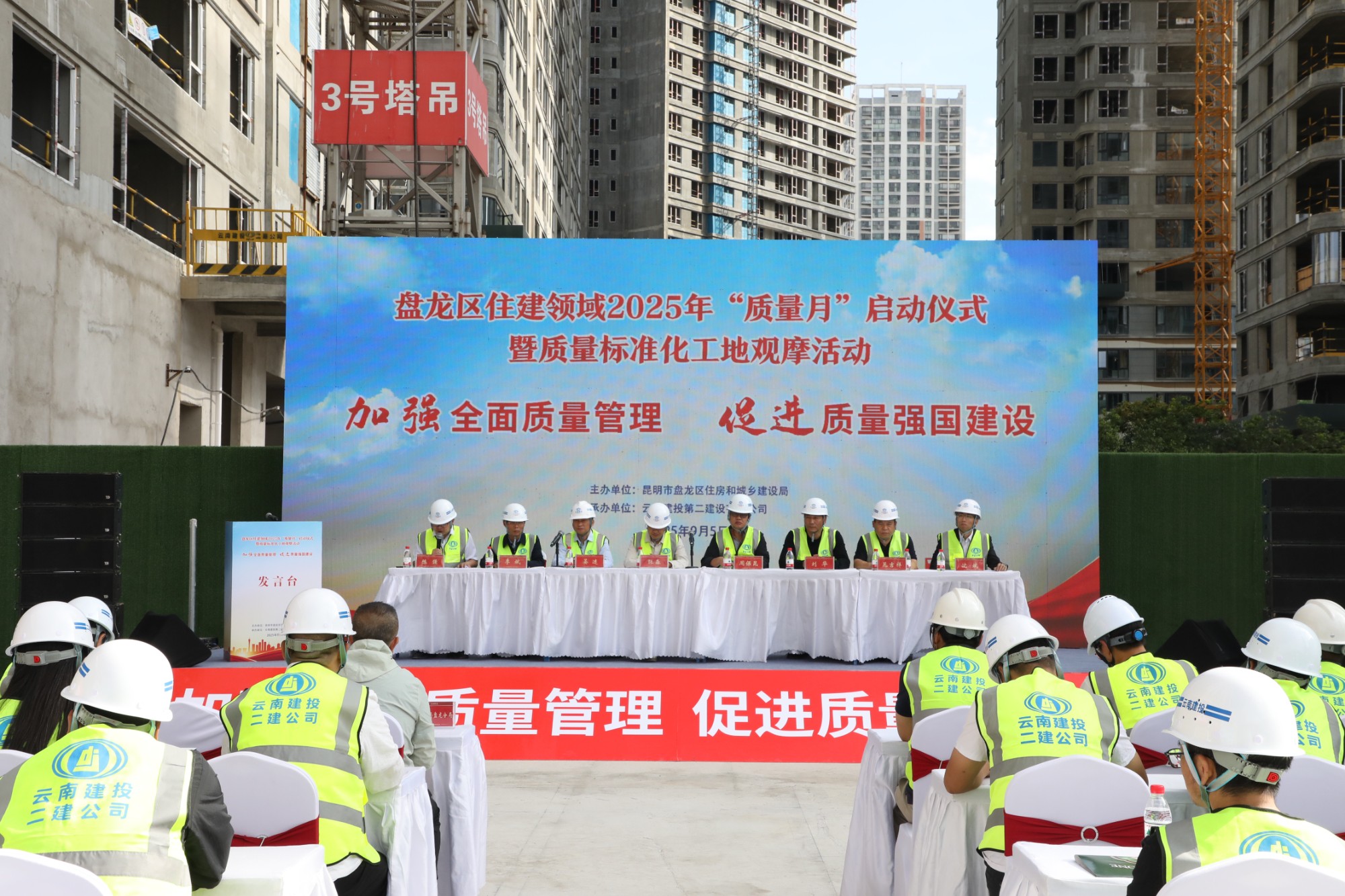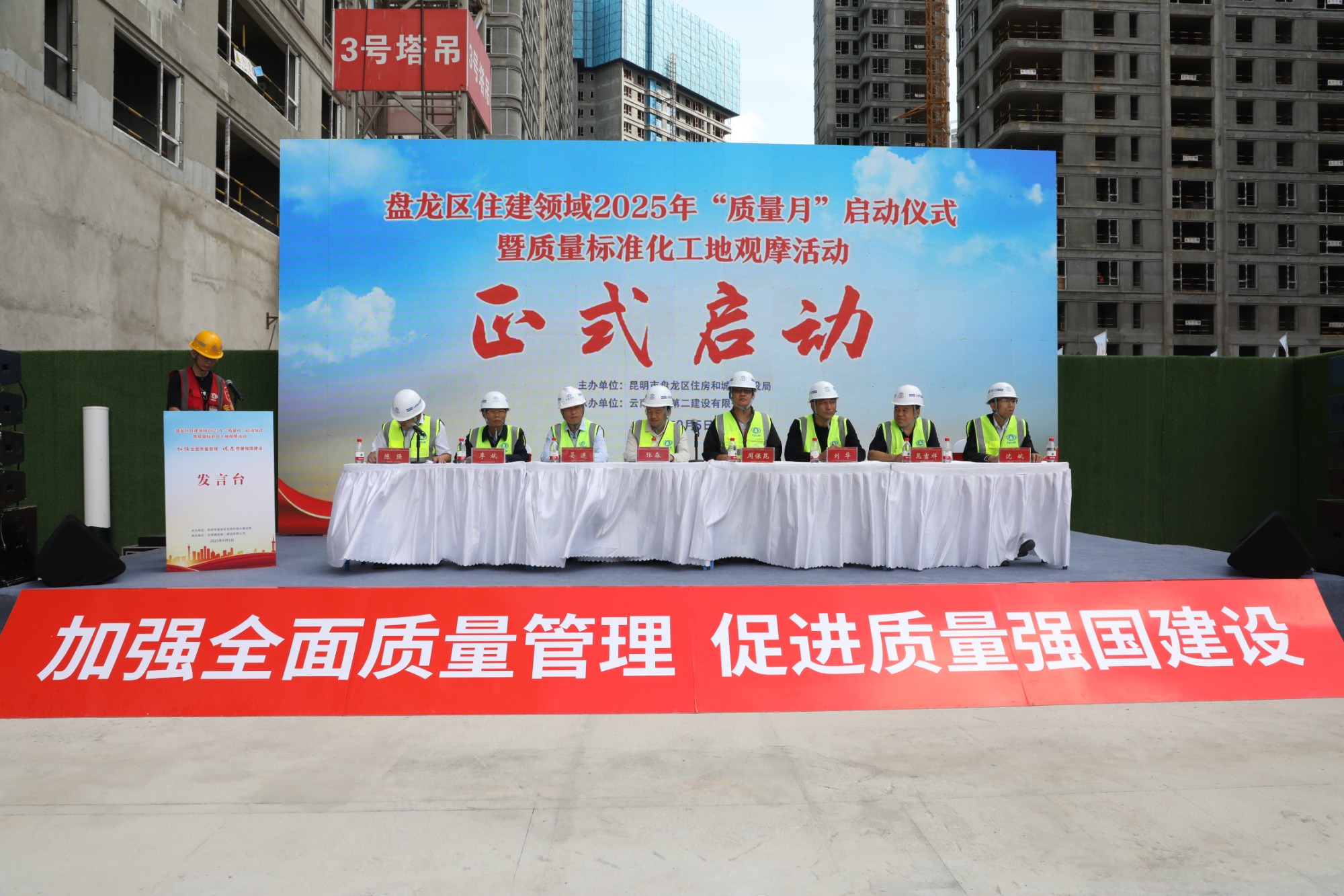 9月5日上午,盤龍區(qū)住建領(lǐng)域2025年“質(zhì)量月”啟動(dòng)儀式暨質(zhì)量標(biāo)準(zhǔn)化工地觀摩活動(dòng)在公司金樾玖璋小區(qū)項(xiàng)目舉行。昆明市建設(shè)工程質(zhì)量安全監(jiān)督管理總站房建處副處長(zhǎng)張淼,公司黨委委員、董事、副總經(jīng)理(主持工作)晏迷,黨委委員、職工董事、副總經(jīng)理、工會(huì)主席李斌,昆明市生態(tài)環(huán)境局盤龍分局,盤龍區(qū)住建局、房屋安全鑒定和建設(shè)工程質(zhì)量安全監(jiān)督站、市場(chǎng)監(jiān)督管理局相關(guān)領(lǐng)導(dǎo)出席活動(dòng)。